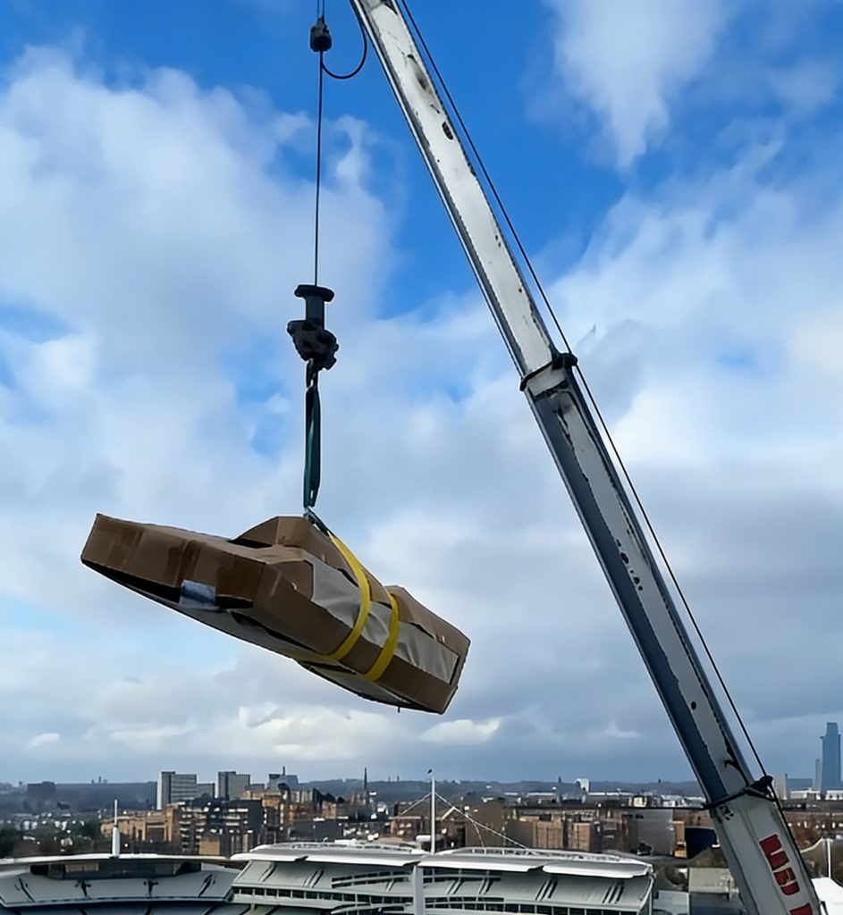 As the giant crane’s arm slowly rises, a massive item is carefully lifted over building exteriors, suspended mid‑air, and finally delivered precisely to its destination via high‑level crane installation. This is a highly complex delivery operation carried out by the UK team at Fuxin International Logistics.